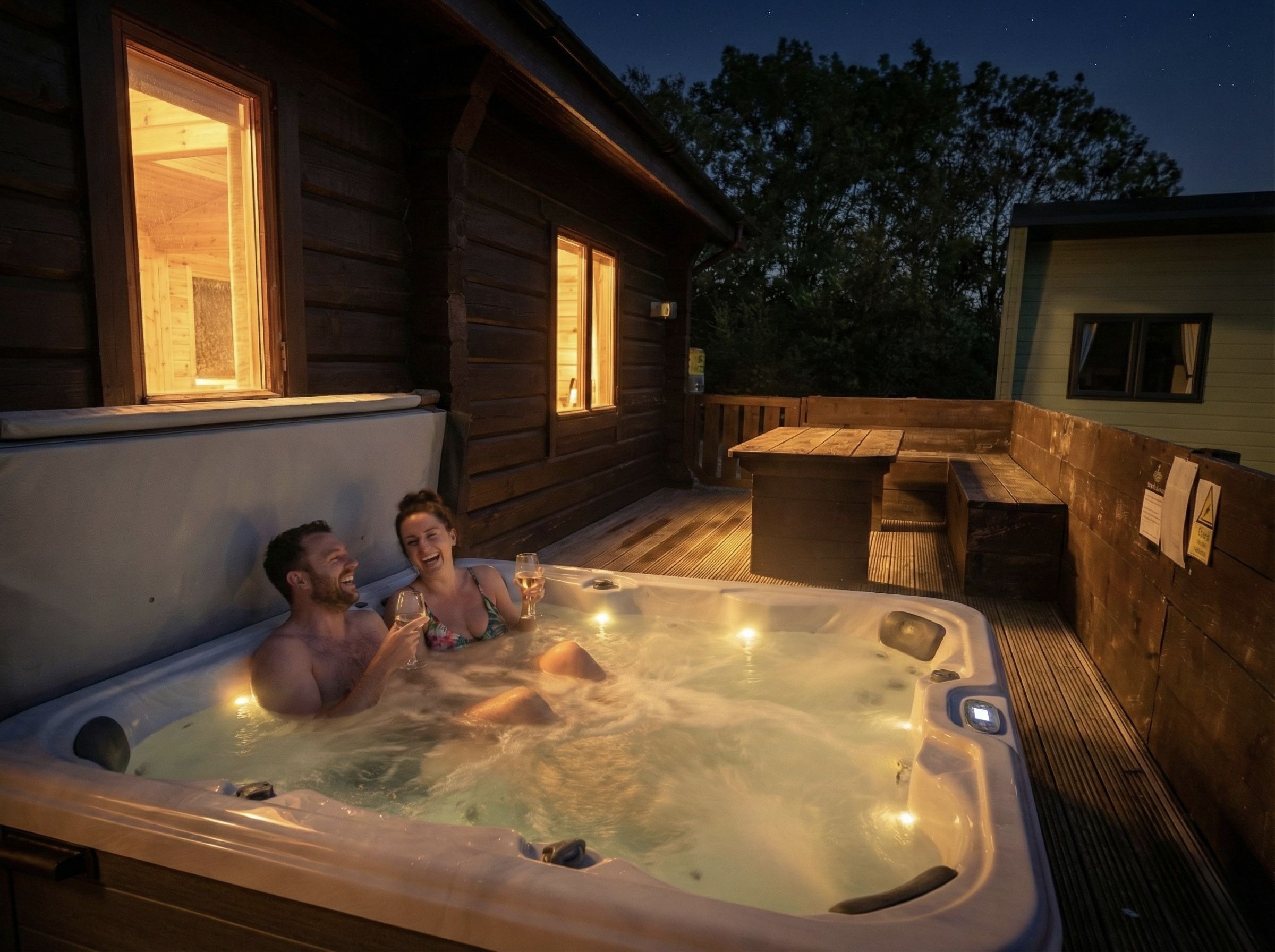 Luxury, contemporary, Estonian pet friendly log cabin with one double with en-suite bathroom and a double bottom single top bunk bedroom. Spacious open plan lounge, kitchen and dining area. Doors leading to an outdoor hot tub with a large decking area and garden area. Surrounded by greenery, this lodge is perfect to relax and unwind.